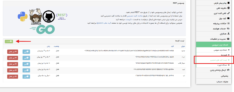 جهت دریافت کلید api اختصاصی پنل خود نیز، لازم است به منوی سمت راست پنل خود > خدمات وب سرویس > لیست کلیدهای دسترسی مراجعه نمایید و از طریق گزینه جدید یک کلید جدید ایجاد نمایید.