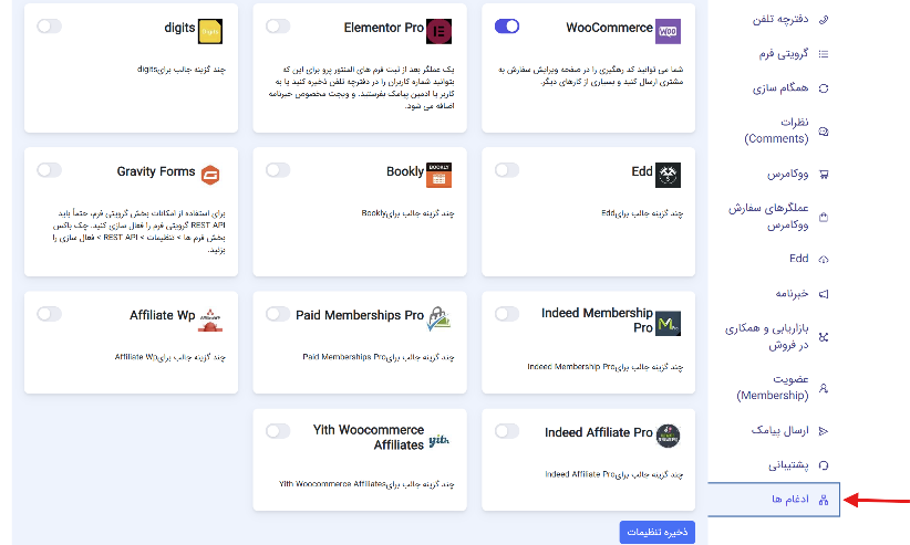 برای نهایی کردن ارتباط بین افزونه فراز و افزونه ووکامرس خود، لازم است به منوی “ادغام ها” مراجعه کرده و تیک ووکامرس را فعال نمایید.