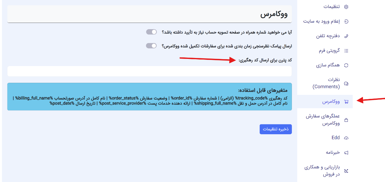 در منوی افزونه فراز اس ام اس گزینه ای به نام ووکامرس قرار دارد. در این بخش باید کد پترن ایجاد شده در مرحله 1 را قرار دهید. این آخرین اقدام برای فعالسازی پیامک کد رهگیری است.